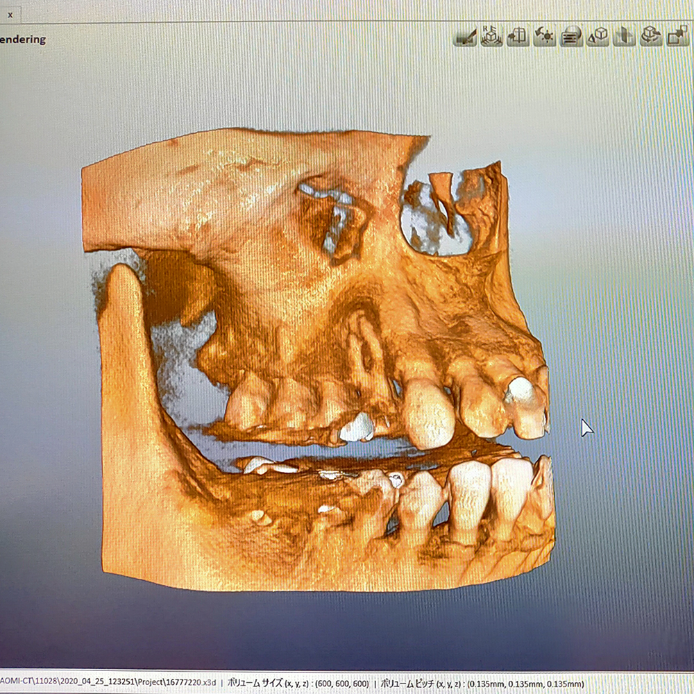 歯科用CTは一般病院に設置されている医科用CTと断層撮影の原理は同じなのですが、医科用CTより解像度が高く、歯や骨等を詳細に調べることができます。また頭頸部の撮影に特化している為、装置は非常に小さく、撮影の為に着替える事無く、座ったまま十数秒で撮影が完了します。