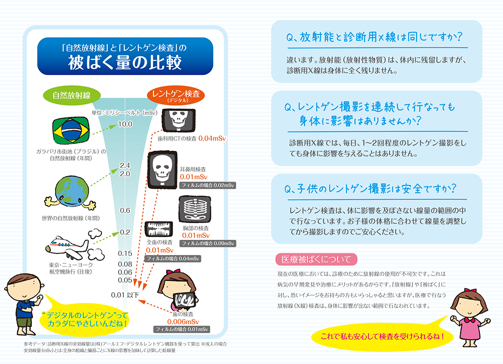 (参考:胸部レントゲン 0.06mSv PET検査 2-20mSv程度 医科用CT 5-30mSv・・・放医研調査)