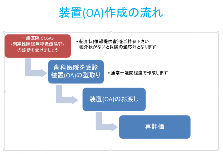 口腔内装置(Oral Appliance:OA)は歯科医院で作られるものですが、健康保険で作る為には、