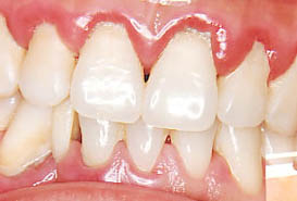 左の画像は歯周病(歯槽膿漏)の歯肉です。上の歯肉とはあきらかに違いますね。